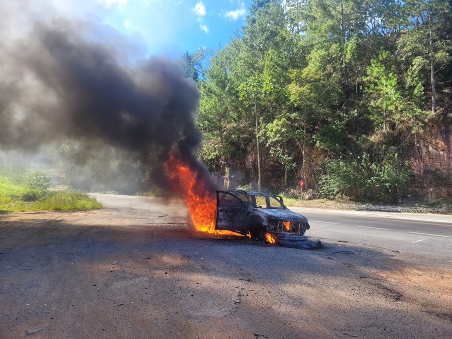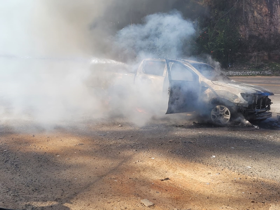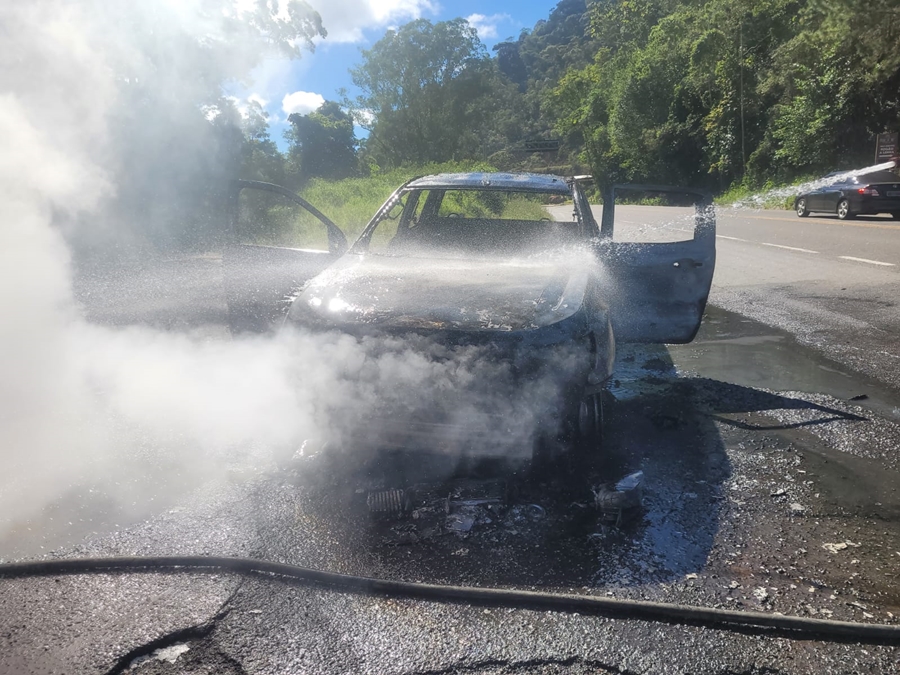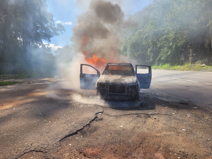 Diante da situação, o motorista agiu rapidamente e encostou a caminhonete no acostamento. Os ocupantes conseguiram sair do veículo e retirar todos os pertences antes que as chamas se espalhassem. Pouco depois, o fogo tomou conta do automóvel.