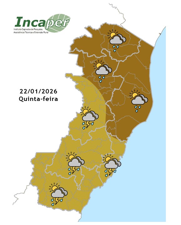 Nesta quinta-feira, a presença de um canal de umidade associado à Zona de Convergência do Atlântico Sul (ZCAS) mantém o tempo instável em todo o Espírito Santo. A previsão indica chuva ao longo do dia, com trovoadas na metade sul do Estado, incluindo a Grande Vitória, e em parte da Região Noroeste. Há ainda risco de acumulados significativos, em razão da persistência das precipitações. As temperaturas máximas apresentam elevação mais acentuada na metade norte, enquanto os ventos sopram fracos a moderados no litoral, de acordo com o Instituto Capixaba de Assistência Técnica e Extensão Rural (Incaper).