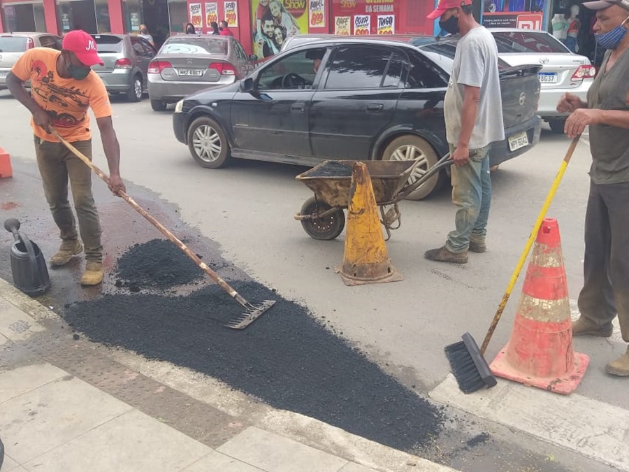 Servidores da Secretaria Municipal de Obras e Serviços Urbanos de Marechal Floriano dão continuidade ao trabalho de cobertura no antigo piso asfáltico no centro da sede de Marechal Floriano. Os trabalhadores buscam a resolução do problema existente na Praça José Henrique Pereira.