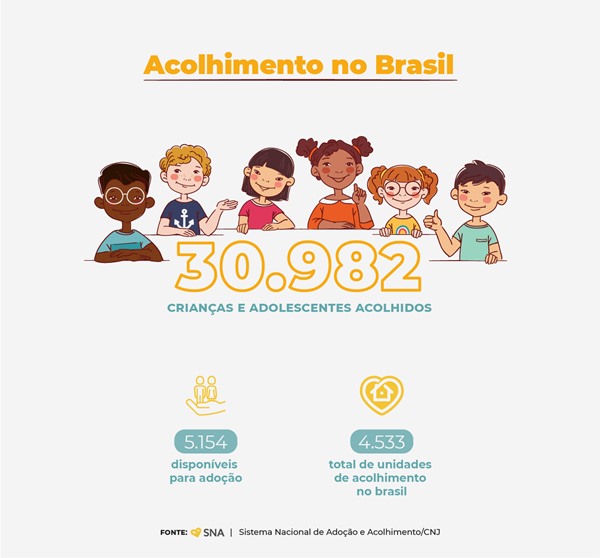 esta semana se comemora o Dia da Criança e a expectativa de milhares de meninos e meninas em todo país é ter uma família. Dados do Sistema Nacional de Adoção e Acolhimento (SNA), do Conselho Nacional de Justiça (CNJ), indicam que mais de 30 mil crianças e adolescentes estão em situação de acolhimento em mais 4.533 unidades em todo o país. Deste total, 5.154 mil estão aptas a serem adotadas.