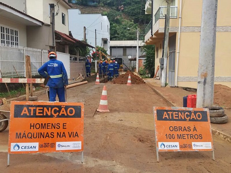 Os trabalhadores de uma empreiteira contratada pela CESAN utilizam equipamentos mecânicos e manuais para garantir a qualidade do serviço da instalação dos tubos. Hoje o grupo se encontra na Rua Sílvio Rogério Lemke, totalmente fechada ao tráfego de veículos.