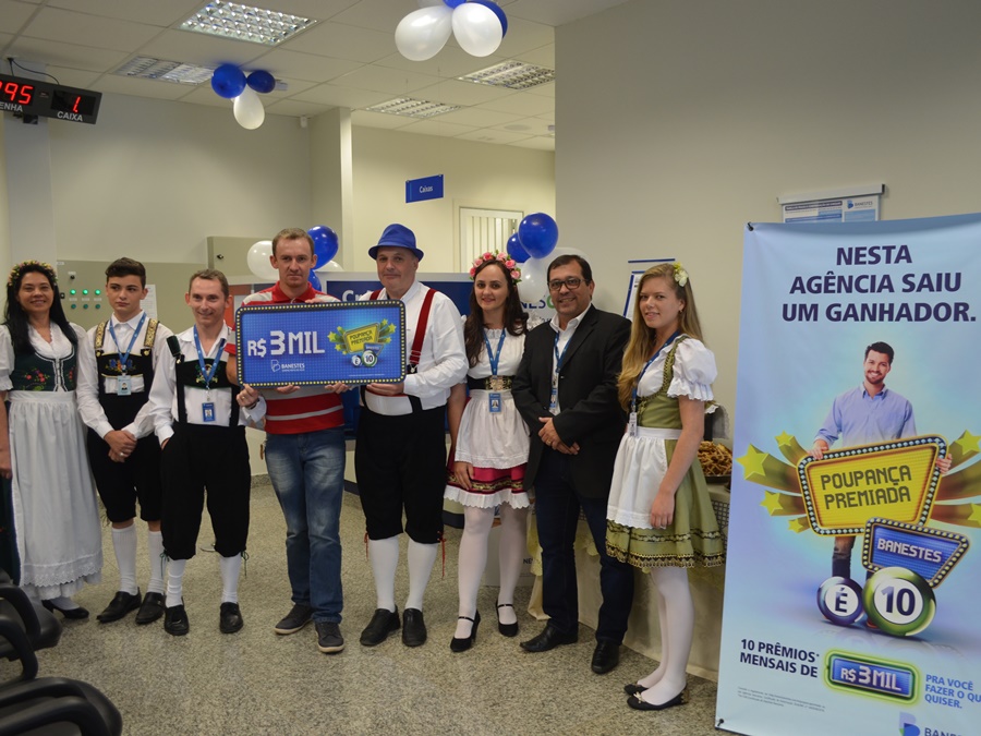 E para entrar no clima da Festa Pomerana, que acontece neste fim de semana no município, a equipe da agência do Banestes estava toda vestida com trajes típicos pomeranos no momento da entrega do cheque ao sorteado. A festa segue até o domingo (07), com uma vasta programação cultural.