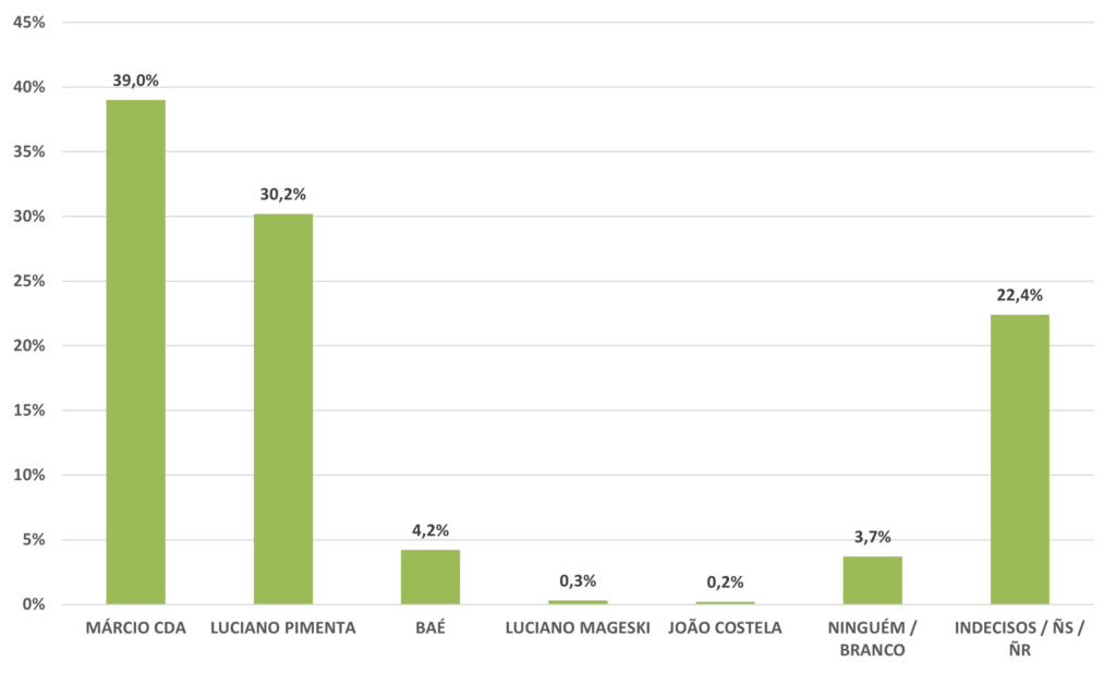 Márcio aparece com 39% das intenções de voto no levantamento espontâneo, quando não são apresentados os nomes dos candidatos. Em seguida está o atual prefeito Luciano Pimenta (PP), com 30,2%. Baé (Avante) é o terceiro colocado, com 4,2%, enquanto Luciano Mageski (Psol) é o quarto mais citado pelos entrevistados, com 0,3%.