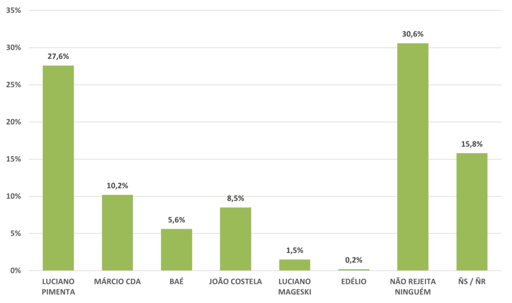 REJEIÇÃO – Já na rejeição, os dois primeiros colocados mudam de posição. Nesse caso, 27,6% dos entrevistados disseram que não votariam em Luciano Pimenta. Márcio CDA é o segundo com maior rejeição, com 10,2%.