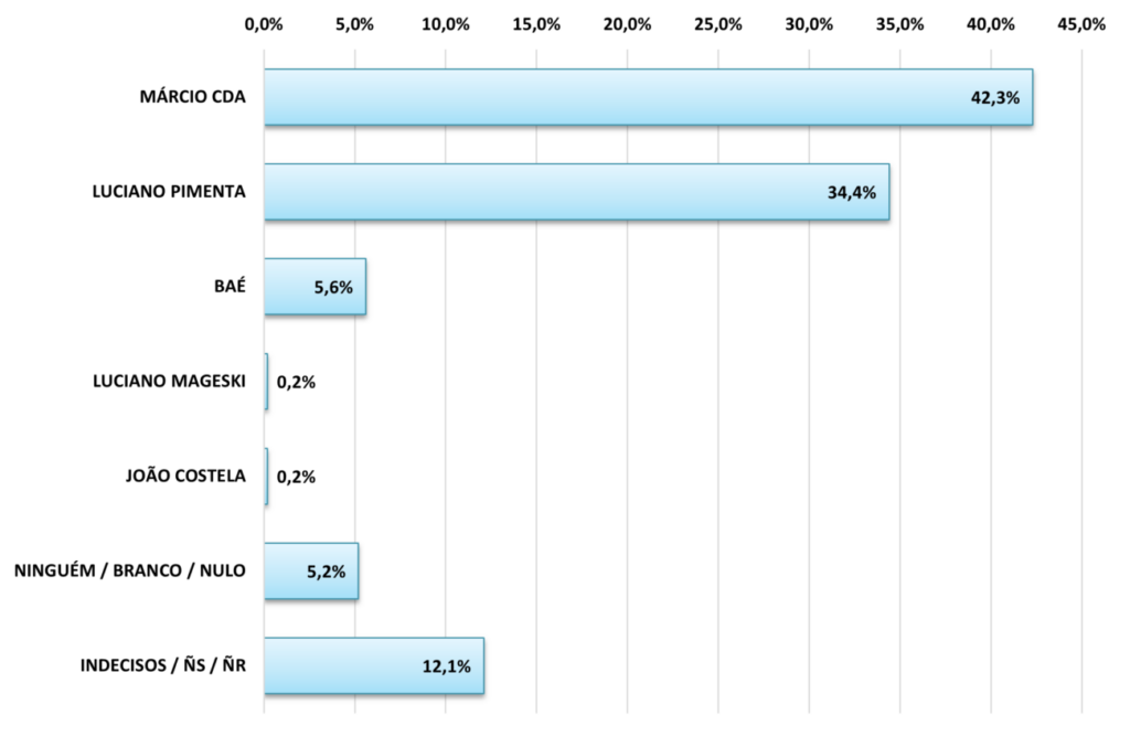 Baé também não muda de posição, e é o terceiro mais citado, com 5,6% das intenções. Luciano Mageski e João Costela aparecem empatados, cada um com 0,2% da preferência dos eleitores entrevistados. Não vota em ninguém, brancos e nulos somam 5,2%. Indecisos, não responderam ou não sabem são 12,1% dos eleitores entrevistados.