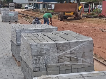 Uma equipe braçais da Prefeitura Municipal de Marechal Floriano, especialista em obras como esta, trabalha durante todo o dia com o apoio de máquinas para espalhar o cascalho onde será o estacionamento e apoiar nos serviços pesados, como o transporte e adequação das peças de calçamento.