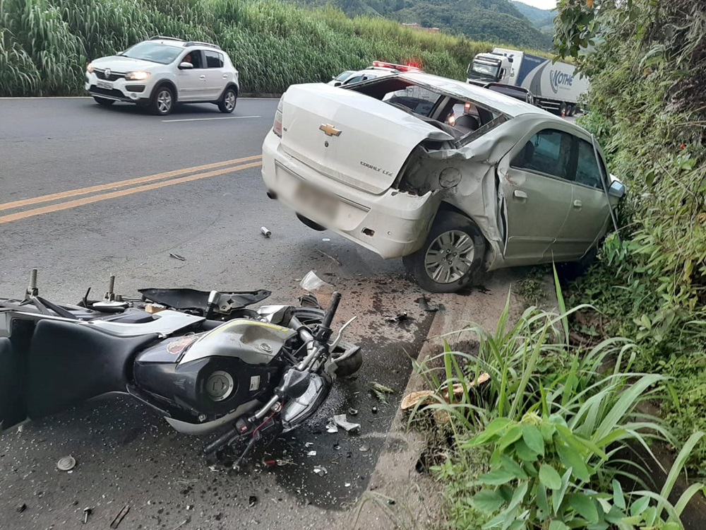 Motociclista e garupa colidem contra carro na BR-262 e sofrem ferimentos graves.