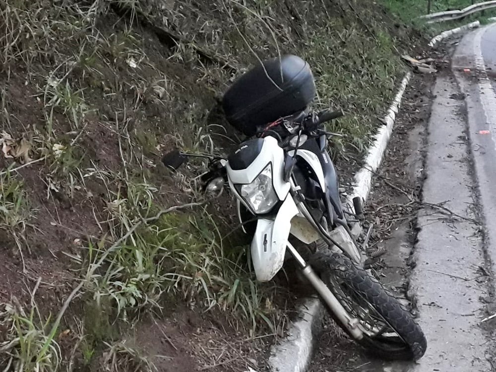Antecedendo ao tombo, a motocicleta bateu de frente à uma placa de sinalização na BR-262 que caiu no piso asfáltico. O motociclista foi liberado no início da noite após o atendimento médico na instituição hospitalar de Domingos Martins e uma empresa de guinchos, autorizada pela PRF, encaminhou a moto que sofreu avarias.