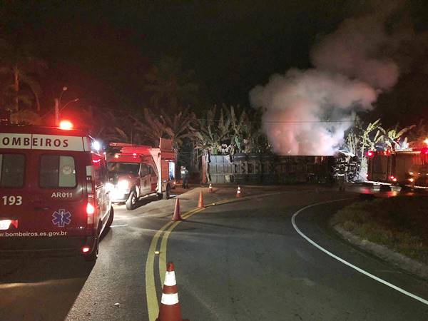 Além de cinco bombeiros do batalhão de Anchieta, três militares de Marechal Floriano também deram apoio à ocorrência. A carreta tem placas de Campos, no Rio de Janeiro. “A rodovia é muito estreita para esse tipo de carreta. Provavelmente o motorista não conhecia bem a estrada, que possui muitas curvas fechadas”, comentou o bombeiro Schunk.