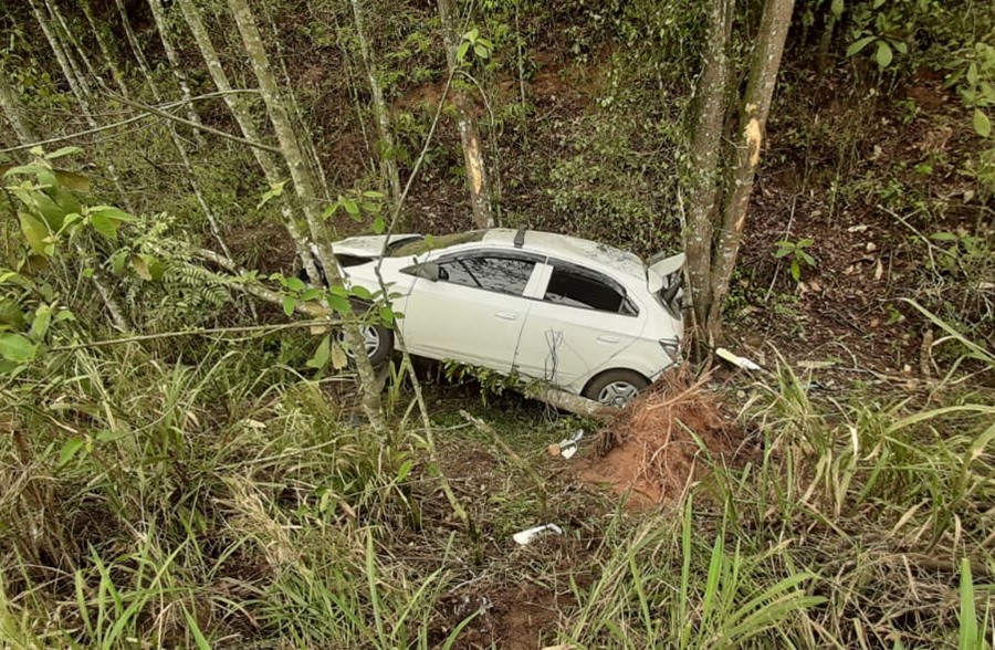 Motorista perde controle de veículo, cai com o carro em barranco e três pessoas ficam feridas
