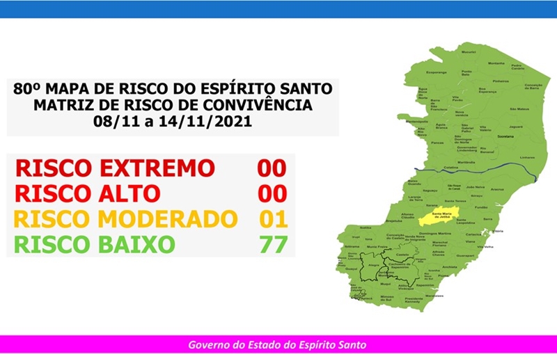 O Governo do Estado anunciou, nesta sexta-feira (05), o 80º Mapa de Risco Covid-19, que terá vigência desta segunda-feira (08) até o próximo domingo (14). Dos 78 municípios capixabas, 77 estão classificados em Risco Baixo e somente um (Santa Maria de Jetibá) em Risco Moderado. Nenhuma microrregião conseguiu atingir os três índices para a classificação de Risco Muito Baixo.