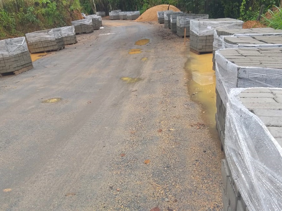 Centenas de embalagens de pisos para calçamento de uma via pública na zona rural de Marechal Floriano estão depositados às margens da estrada que receberá este benefício. A obra que se encontra paralisada na atualidade em função das fortes chuvas que caem nos últimos dias nesta cidade.