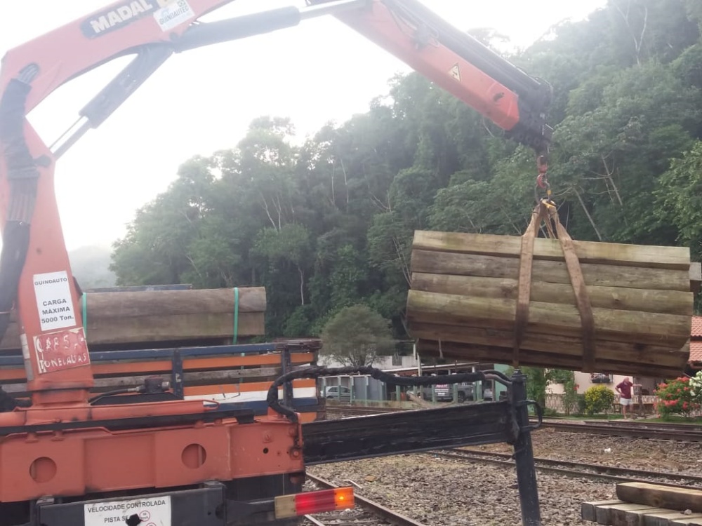 Peças de madeira da ferrovia são transportadas para Araguaya em Marechal FlorianoNesta manhã de quarta-feira (01) uma equipe técnica de ferroviários iniciou o trabalho de remoção dos dormentes de madeira para Araguaya. O material é erguido por um guincho e posto sobre a carroceria do mesmo caminhão e logo após é removido para o antigo pátio de carregamentos de eucaliptos.