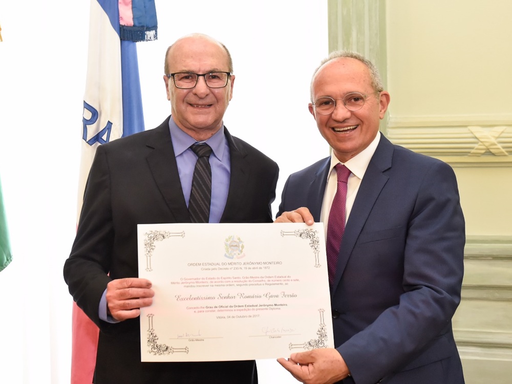 O governador Paulo Hartung entregou, na tarde desta quarta-feira (04), a Comenda Jerônimo Monteiro ao pesquisador do Instituto Capixaba de Pesquisa, Assistência Técnica e Extensão Rural (Incaper) e coordenador do programa estadual de cafeicultura, Romário Gava Ferrão. A solenidade foi realizada no Salão Nobre do Palácio Anchieta, em Vitória. A Comenda Jerônimo Monteiro é a mais alta honraria concedida a um cidadão capixaba.