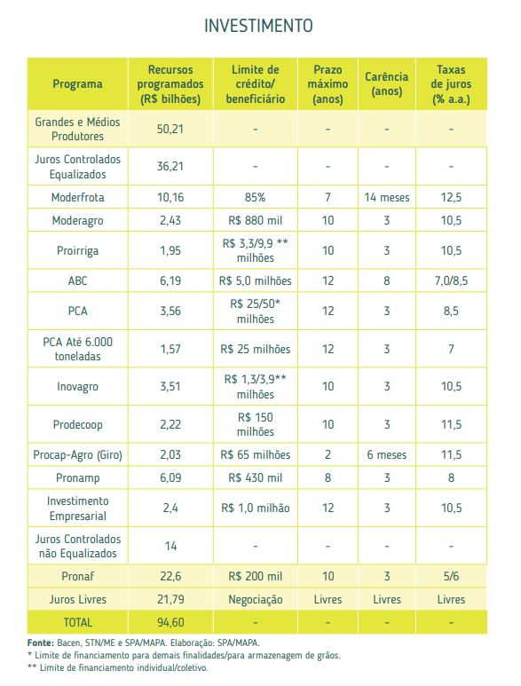 Para os demais produtores e cooperativas, o total disponibilizado chega a R$ 243,4 bilhões, com taxas de juros de 12% ao ano. Os produtores rurais também podem optar pela contratação de financiamento de investimento a taxas de juros pós-fixadas.