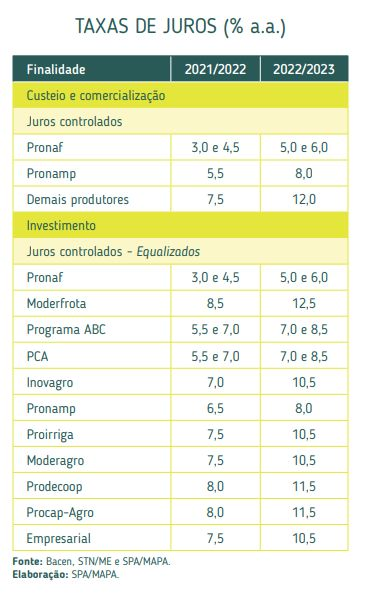 A melhoria do acesso do produtor ao crédito rural foi assegurada não só pelo aumento nas disponibilidades de recursos, mas também pelo estabelecimento de taxas de juros compatíveis com a atividade rural e em níveis favorecidos, comparativamente às taxas livres de mercado. Com a taxa básica de juros da economia (Selic) em 13,25% atualmente, buscou-se preservar, prioritariamente, elevações menores para os beneficiários do Pronaf e do Pronamp, garantindo financiamento adequado para esses públicos.