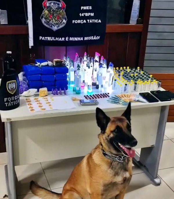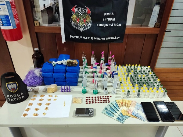 Além da dupla, também foram apreendidos 118 frascos de lança perfume, 24 frascos grandes de lança perfume, oito pinos de cocaína, uma porção de cocaína de 43 gramas, 37 comprimidos de ecstasy, 170 pedras de crack, 106 gramas de crack, uma porção de crack, 10 tabletes de maconha (10kg), dois tabletes de maconha de um quilo, um pedaço de maconha, três porções de maconha, material de preparo/embalo, uma balança e dinheiro em espécie.