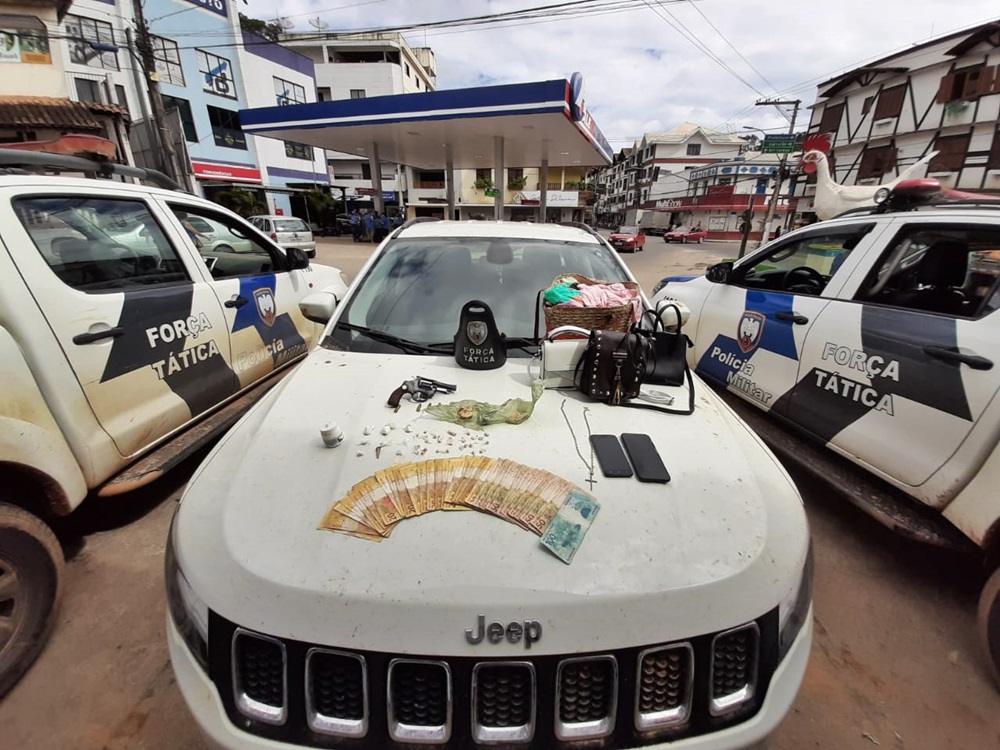 Na residência em que estavam os indivíduos, foram encontrados um revólver calibre 32 com quatro munições intactas; porções, papelotes e pinos de cocaína; 34 pedras de crack e dinheiro em espécie. O primeiro homem a ser detido contou aos policiais que o veículo estava na localidade Luiz Potratz, na casa de um conhecido. A PM foi até o local e recuperou o veículo.