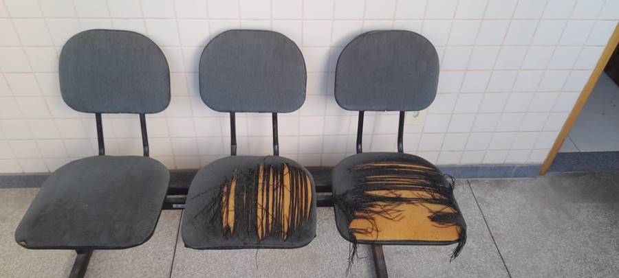Condições insalubres para servidores – Funcionários estavam trabalhando em espaços inadequados, com mesas improvisadas e sem condições básicas de higiene e segurança.
