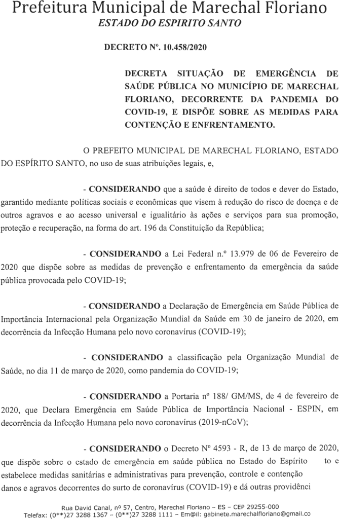 Prefeitura Municipal de Marechal Floriano – Decreto Municipal nº 10.458/2020