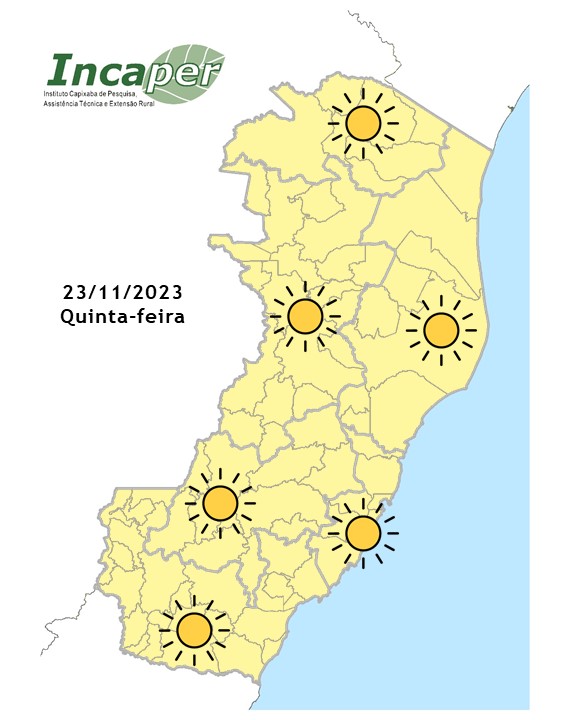 De acordo com o Instituto Capixaba de Pesquisa, Assistências e Extensão Rural (Incaper) a previsão para hoje (23) é de tempo aberto em todo o Espírito Santo com poucas nuvens e sem expectativa de chuva. O vento sopra com moderada intensidade pelo litoral, com possibilidade de rajadas entre o litoral sul e o metropolitano.