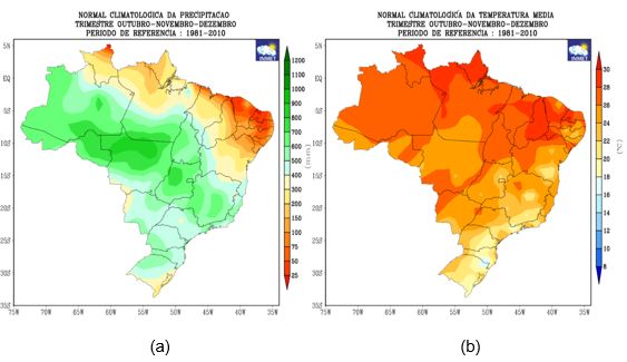 Durante a estação, os acumulados de chuva no norte da Região Nordeste costumam ser inferiores a 100 milímetros (mm), principalmente, no norte do Piauí e noroeste do Ceará. As temperaturas são mais elevadas em grande parte da Região Norte, interior do Nordeste e em alguns pontos da parte central do Brasil (figura 1b).