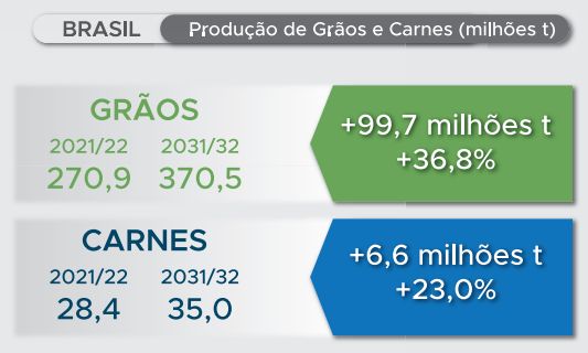 Segundo o estudo, o mercado interno, as exportações e os ganhos de produtividade deverão ser os principais fatores de crescimento na próxima década. O estudo aponta uma tendência de crescimento com ganhos de produtividade, já que a área de grãos deve aumentar 17% entre 2021/22 e 2031/32, passando de 74,3 milhões de hectares em 2021/22 para 86,9 milhões de hectares em 2031/32, o que corresponde a um acréscimo anual de 1,6%.