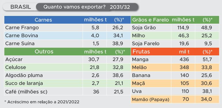EXPORTAÇÕES – As exportações de carne suína devem crescer 38,9% na próxima década, chegando a 1,5 milhão de toneladas. Carne bovina e de frango também devem crescer, respectivamente 34,1% e 26,2%. Nos grãos, o destaque das exportações é a soja em grão, com previsão de crescimento de 48,9%, chegando a 114,9 milhões de toneladas. Algodão em pluma e celulose também devem ganhar espaço no mercado externo, com crescimento de 38,6¨e 32,8% nas exportações.