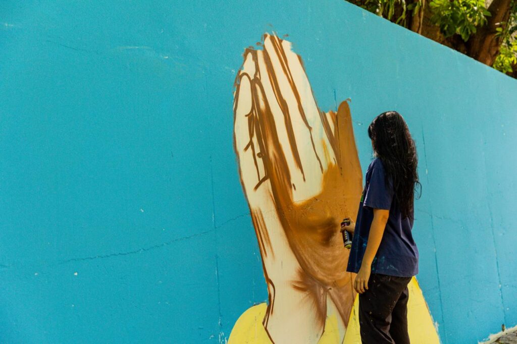 Além dos murais individuais, os quatro artistas também se unem em uma obra coletiva, reforçando, na prática, o espírito do tema deste ano: a construção conjunta da paz.