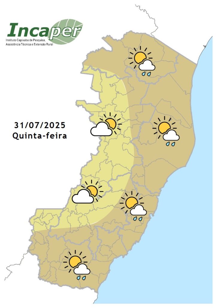 Na Região Noroeste, apesar do tempo mais seco, há possibilidade de chuva isolada entre o fim da tarde e a noite em áreas específicas. Em cidades como Mantenópolis e Alto Rio Novo, os termômetros devem variar entre 15 °C e 29 °C.