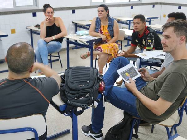Em um determinado período do evento, os docentes foram divididos em grupos e direcionados as suas respectivas salas, de acordo com o planejamento da SECEDU, onde havia palestras e oficinas.