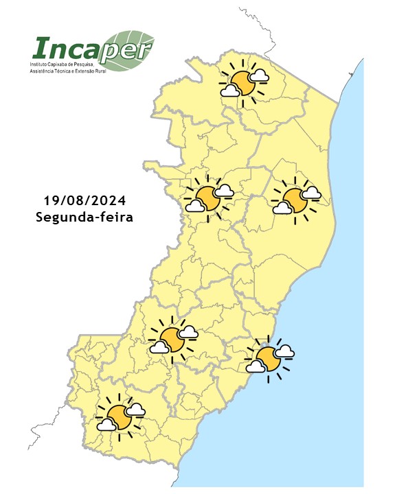 Em Mantenópolis e Alto Rio Novo: mínima de 18 °C e máxima de 26 °C.