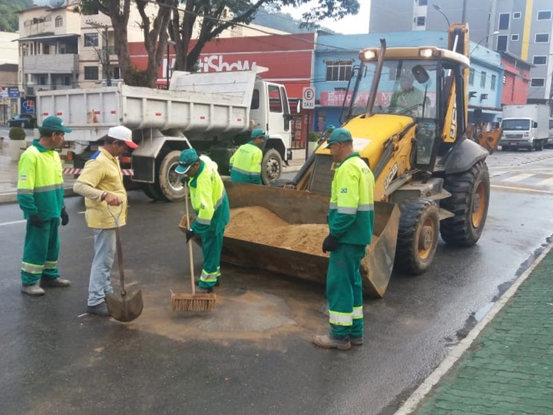 Servidores municipais limpam via onde foi realizada a procissão de Corpus Christi 2A limpeza da areia que serviu como base para os ornamentos do chão da rua, começou pela madrugada e encerrou nesta manhã. Vinte braçais estavam no local para trabalhar amontoando a areia com pás e vassouras para uma retroescavadeira encher a pá e despejar sobre as basculantes. Todo o piso foi lavado por outra equipe no carro pipa da Prefeitura Municipal.