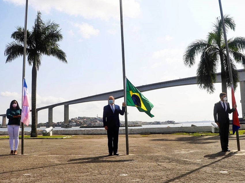 O governador do Estado, Renato Casagrande; a vice-governadora Jaqueline Moraes; e o prefeito de Vila Velha, Arnaldinho Borgo, hastearam as bandeiras do Brasil, do Espírito Santo e do município, respectivamente. Durante a solenidade, foi feito um minuto de silêncio em homenagem às vítimas da Covid-19.
