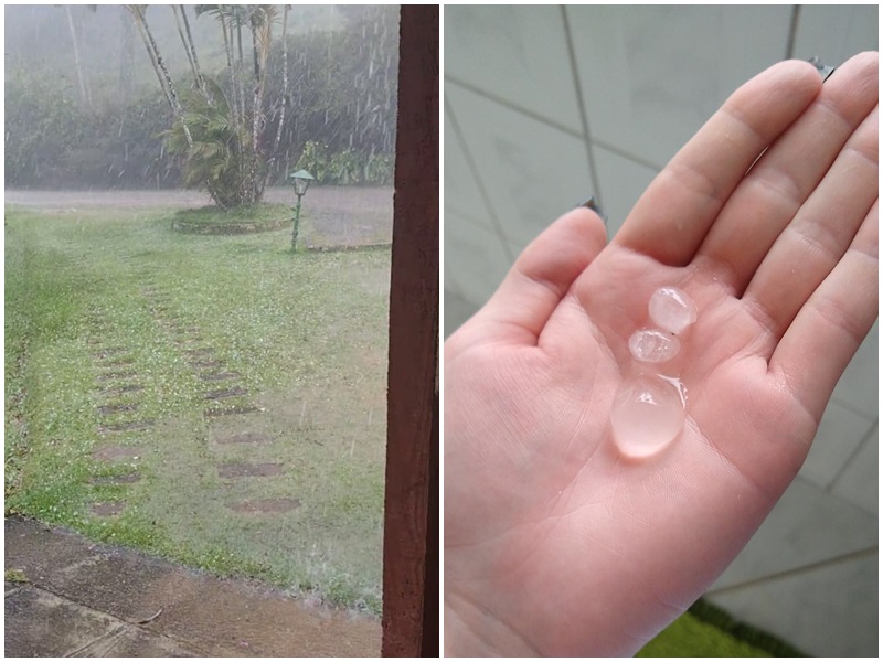 GRANIZO – Na tarde de ontem (16), por volta de 16h45, uma forte chuva com granizo e ventos derrubou árvores em estradas rurais de Domingos Martins, como na localidade de Soído de Cima. Ronaldo Guedes, proprietário do Restaurante Italiano, registrou em vídeo a queda de granizo no gramado em frente ao seu restaurante.