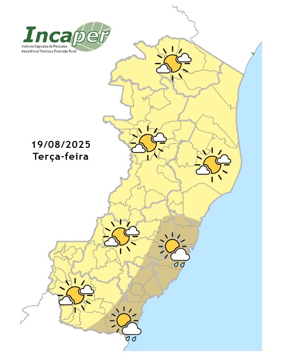 O Espírito Santo terá predomínio de tempo aberto nesta terça-feira (19), devido à atuação de um sistema de alta pressão que traz ar seco para o Estado. Apesar disso, há previsão de chuva fraca durante a madrugada e a manhã no litoral sul e na Grande Vitória, por influência da umidade vinda do mar. Os ventos sopram de fracos a moderados ao longo da faixa litorânea, conforme informou o Instituto Capixaba de Assistência Técnica e Extensão Rural (Incaper).