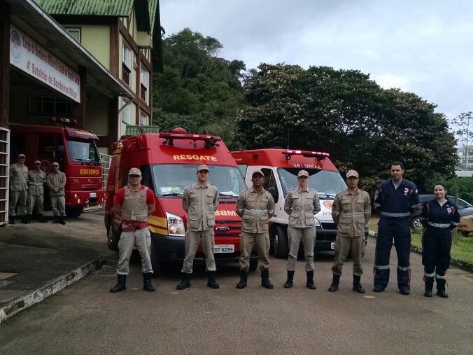 Rapidamente, o Corpo de Bombeiros enviou para o socorro o Autobomba Tanque Salvamento – que é o seu carro grande – e um carro de resgate, com oito elementos. Já o Samu enviou uma ambulância, com dois elementos (na foto, os veículos dos Bombeiros e do Samu e toda a equipe mobilizada).