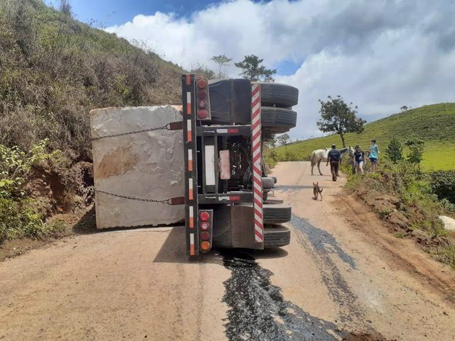 Um caminhão tombou com semireboque acoplado, transportando um bloco de rocha ornamental, na localidade de Mata Fria, em Conceição do Castelo, na tarde dessa terça-feira (27). O condutor do veículo precisou de atendimento médico e foi levado ao Hospital Padre Máximo por populares.
