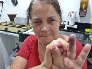 Ela também buscou ser atendida por um médico particular, mas o profissional já não estava mais em seu consultório na ocasião. Depois de idas e vindas, ela decidiu ir até uma farmácia, comprar esparadrapo, gaze e palitos de madeira, com o objetivo de imobilizar o dedo.